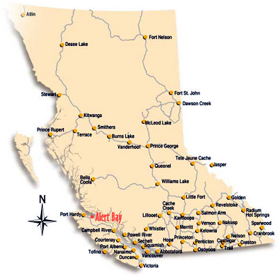 Alert Bay is about 3 kilometers off the northeast coast of Vancouver Island and is approximately 180 miles by water from the city of Vancouver.